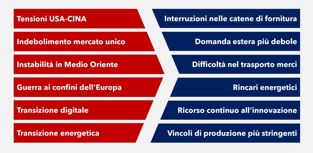 Insieme agli effetti dei numerosi shock elencati vanno considerati quelli prodotti dalle tendenze di lungo periodo, come la digitalizzazione e i cambiamenti climatici. Le imprese, infatti, si trovano a dover innovare di continuo sia per tenere il passo con il progresso tecnologico, sia per l’adozione di strategie di produzione sempre più sostenibili. Ne emerge un quadro di riferimento caratterizzato da un grado di complessità straordinario (Grafico).