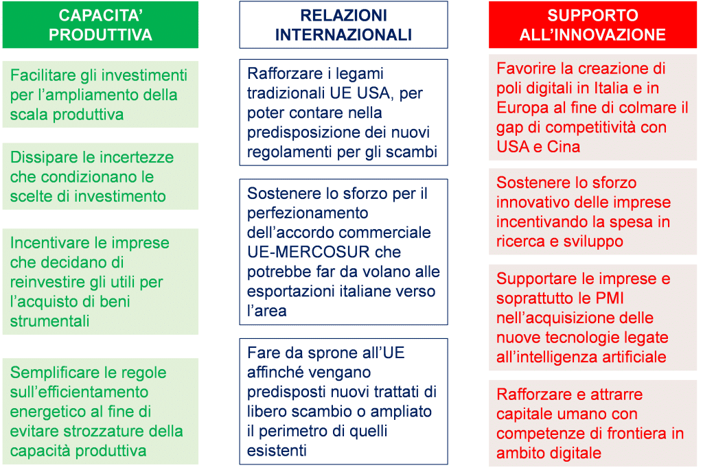 Il fatto che ci siano ampi margini di miglioramento per l’export italiano non significa che la sua realizzazione sia automatica. Aumentare le esportazioni implica a monte un aumento della produzione, che a sua volta passa per una crescita degli investimenti. A tal fine è necessario uno sforzo coordinato di imprese e istituzioni per favorire un irrobustimento generalizzato del sistema produttivo italiano e della sua competitività lungo vari assi. Se da un lato le imprese dovrebbero impegnarsi nel destinare risorse a investimenti produttivi, dall’altro le istituzioni dovrebbero spronare questo processo attraverso la mitigazione degli elementi di incertezza che condizionano le scelte di investimento da parte delle imprese e la predisposizione di incentivi per tutte le imprese che decidano di reinvestire i propri utili per l’acquisto di beni strumentali.