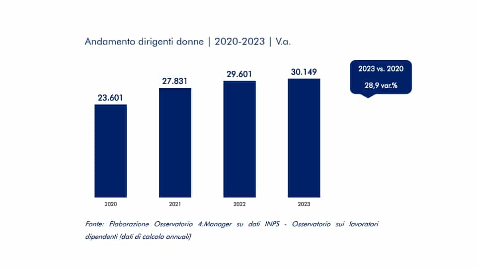 A livello nazionale, il numero di donne dirigenti è aumentato del 28,9% in quattro anni dal 2020 (da 23.601 a 30.419 unità), mentre quello maschile solo del 7,7% (da 99.985 a 107.658 unità).