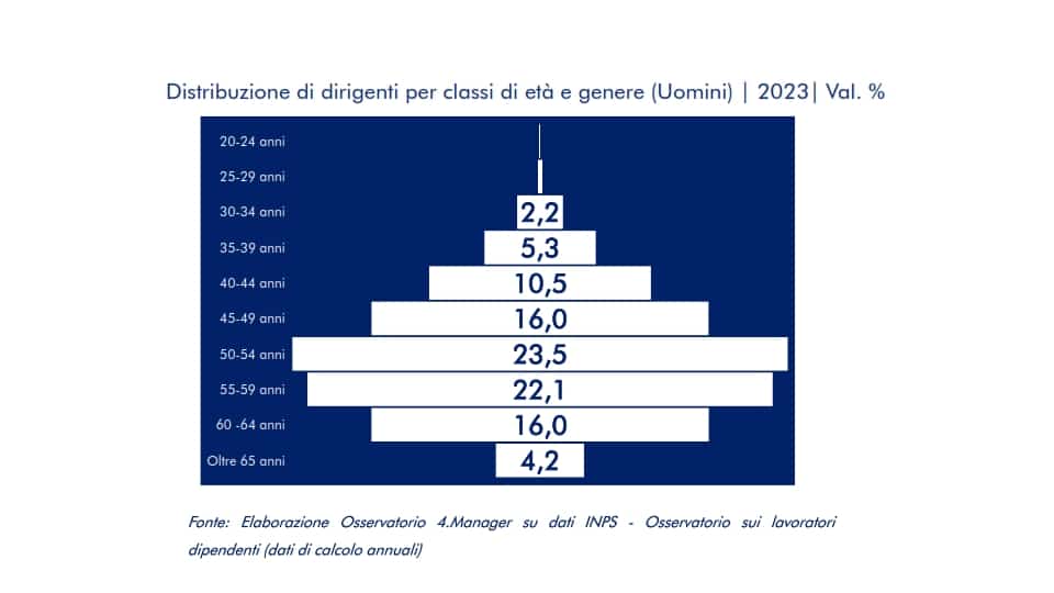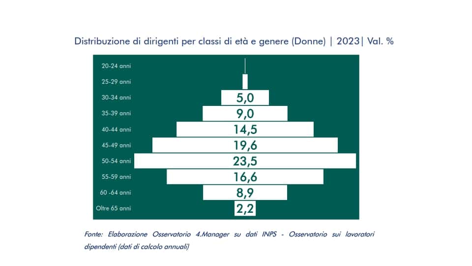 Particolarmente evidente è la differenza nella fascia over 65, dove si osserva il 4,2% dei dirigenti uomini contro appena il 2,2% delle dirigenti donne, confermando una maggiore difficoltà per le donne a mantenere posizioni apicali nelle fasi avanzate della carriera.
