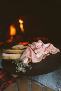 In più, per regalare alla carne quel sapore unico ormai riconosciuto non solo dagli abitanti del territorio, la ricetta prevede l’utilizzo di ingredienti altrettanto ricercati. “Per calibrare gusto ed aroma, dopo aver fatto un’infinità di prove, ci serviamo unicamente della pianta Genepy, erba aromatica che cresce in zona, e di miele millefiori valdostano e biologico. Un mix che accentua le caratteristiche olfattive del prosciutto cotto, che successivamente viene legato e infine avviato alla fondamentale fase della cottura. Momento in cui il jambon è prima trattato con il vapore ed in seguito innaffiato con la ‘birra del San Bernardo’, bionda di 4,8 gradi alcolemici e senza glutine, mentre rosola con la giusta lentezza nel forno a legna. Alla fine del processo non diventa affumicato come, per esempio, il Praga, ma raggiunge un gusto adatto per essere mangiato sia caldo che freddo”.