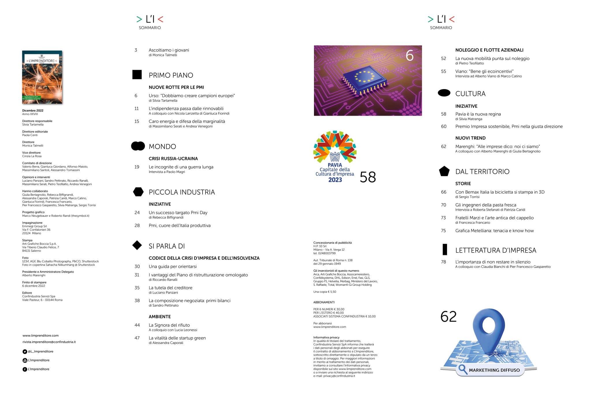 Per la seconda parte del focus sul Codice della crisi d’impresa e dell’insolvenza, ospitiamo gli interventi di Riccardo Ranalli, Luciano Panzani e Sandro Pettinato, mentre con Paolo Magri, vice presidente Ispi, analizziamo l’evoluzione del conflitto in Ucraina. Alberto Marenghi racconta il progetto di “marketing diffuso” di Confindustria, mentre su questo numero sono ben quattro le storie aziendali, provenienti da Umbria, Liguria, Toscana e Campania. E ancora rubriche, interviste, libri e molto altro