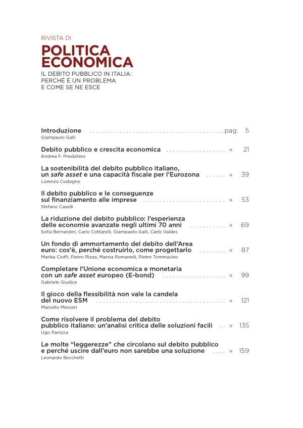 Il primo volume della nuova serie è composto da 10 contributi sul debito pubblico. I primi tre lavori, di Lorenzo Codogno, Andrea Presbitero e Stefano Caselli, fanno il punto su quello che sappiamo circa la gravità del problema nel contesto italiano e dei suoi riflessi sulla crescita economica, sulla stabilità del sistema bancario e sulla competitività delle imprese. I successivi tre lavori – uno di Sofia Bernardini, Carlo Cottarelli, Giampaolo Galli e Carlo Valdes, un secondo di Marika Cioffi, Pietro Rizza, Marzia Romanelli e Pietro Tommasino e il terzo di Gabriele Giudice – si interrogano sulle soluzioni possibili, anche alla luce degli sviluppi che si stanno affermando in Europa riguardo alla governance dell’Eurozona di cui tratta il lavoro di Marcello Messori. Gli ultimi due lavori, di Ugo Panizza e Leonardo Becchetti, trattano di quelle che vengono spesso propagandate come soluzioni, ma sono illusorie: aumento del deficit per spingere sul denominatore del rapporto debito/PIL, ripudio del debito, monetizzazione e uscita dall’euro.